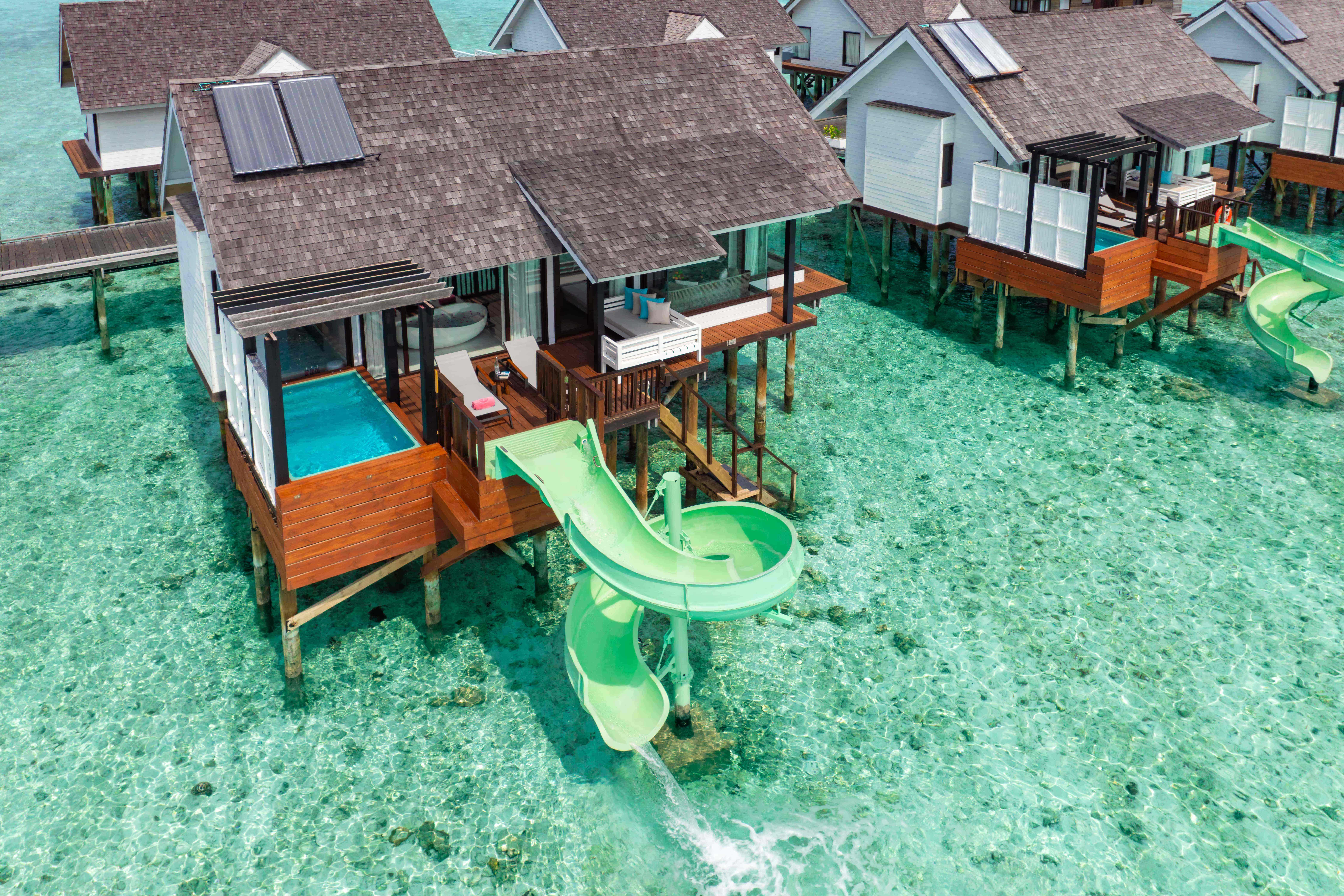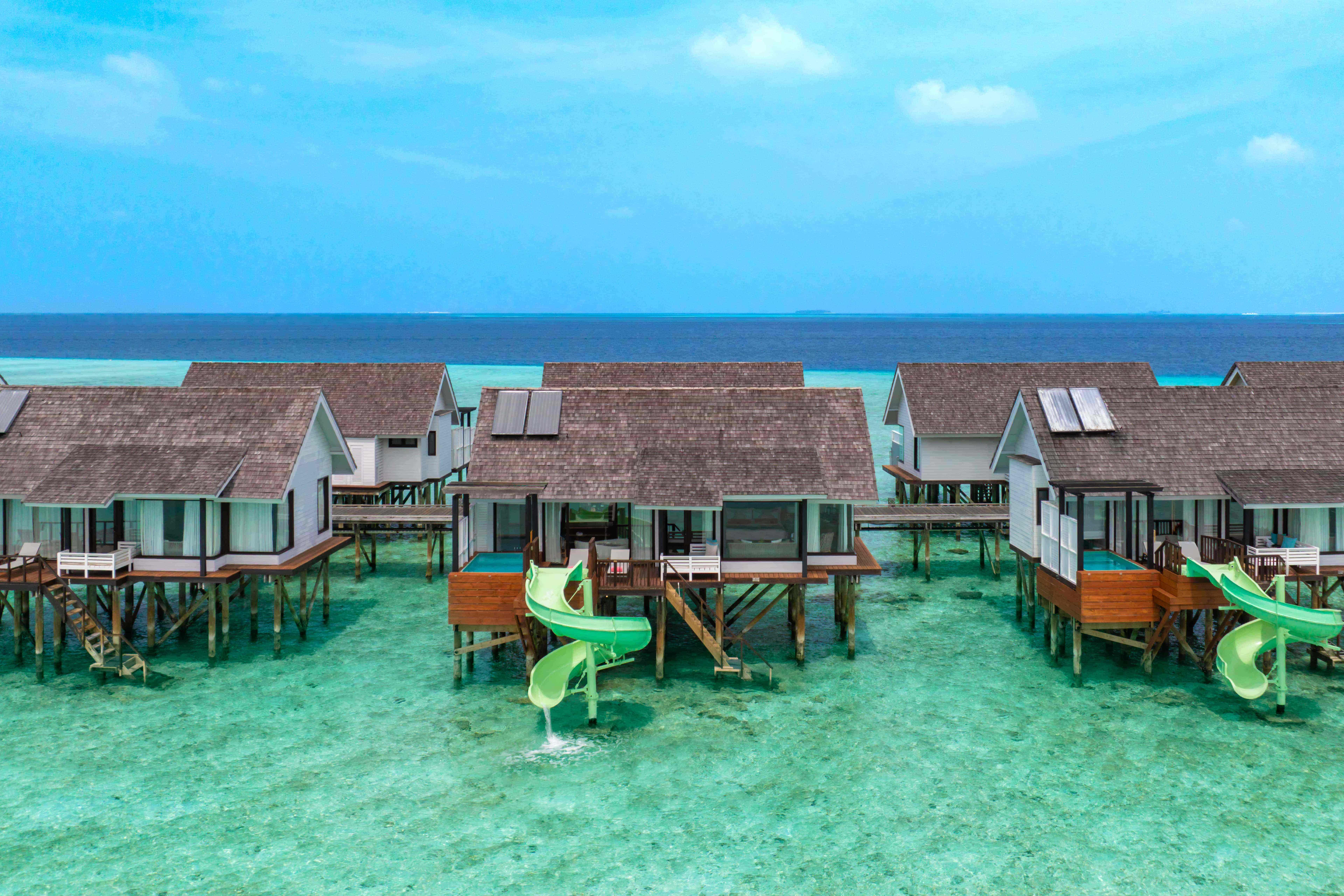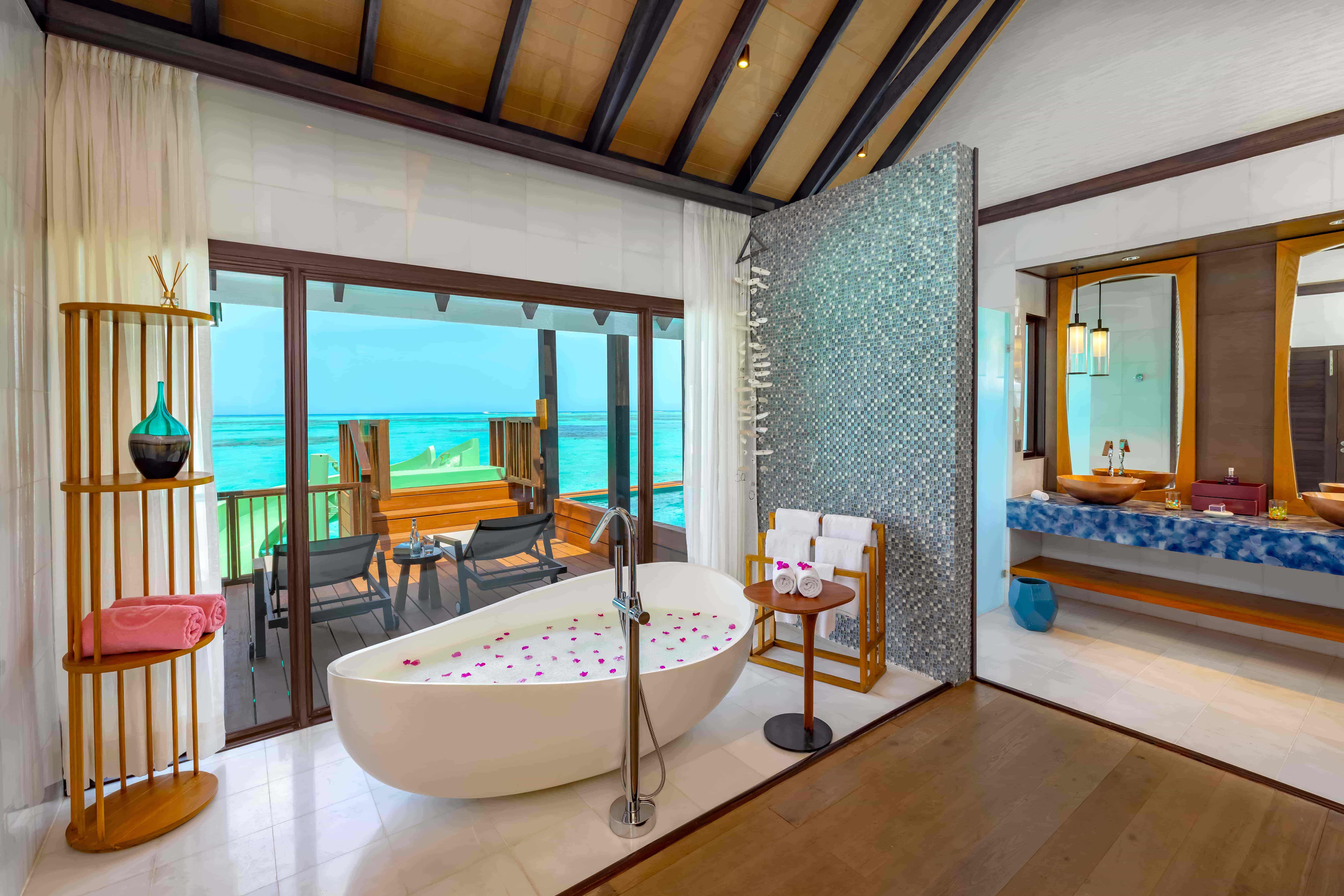 超越水面的极致奢华,尽在玩乐之中。“风之别墅”配备按摩浴缸和滑梯,是印度洋上的专属游乐场。在按摩浴缸中浸泡,眼前是无尽的海平线,下方是海浪的曼妙舞姿。意犹未尽?直接滑入潟湖,体验一番冒险的刺激。别墅内部则展现出其热带风情,宁静之中透露出一丝顽皮。